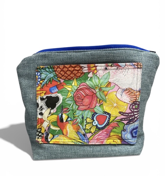- Delantero: realizado con un retal de cabra azul y un bolsillo de piel imitando el trencadis de Gaudí. .