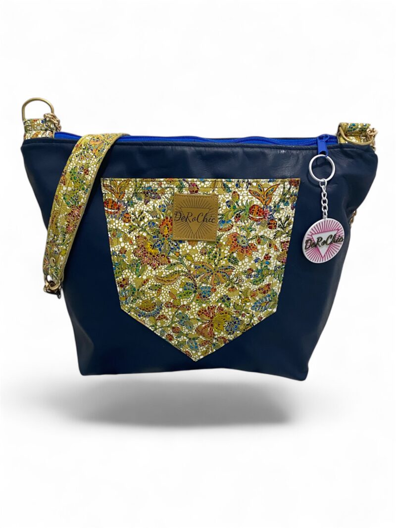 - Delantero: realizado con un retal de cabra azul y un bolsillo de piel imitando el trencadis de Gaudí. .