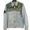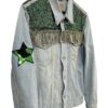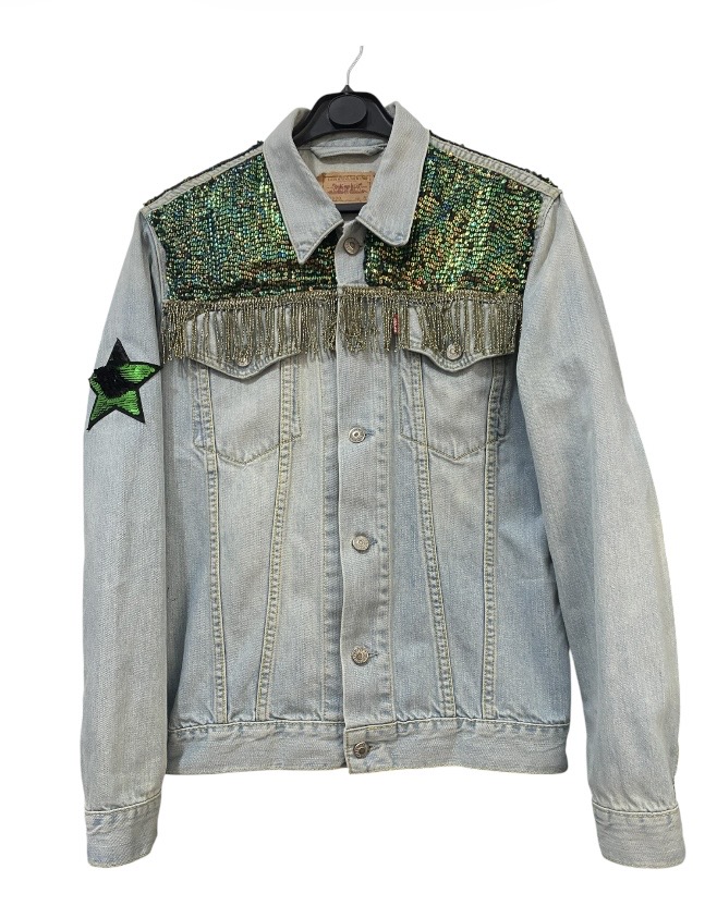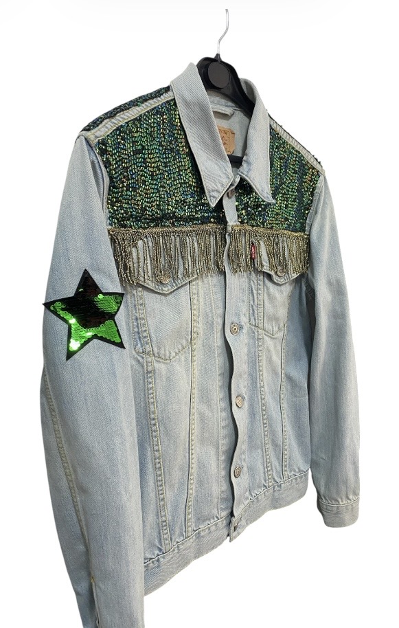 - La manga derecha tiene un parche de lentejuelas con forma de estrellas que cambian de color verde o negro .