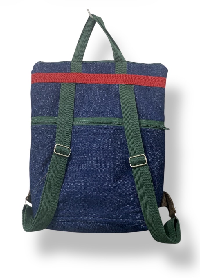 •  la parte posterior está realizada con tejido vaquero ,  tiene un bolsillo del mismo vaquero  para guardar tus cosas sin peligro que te las roben .
