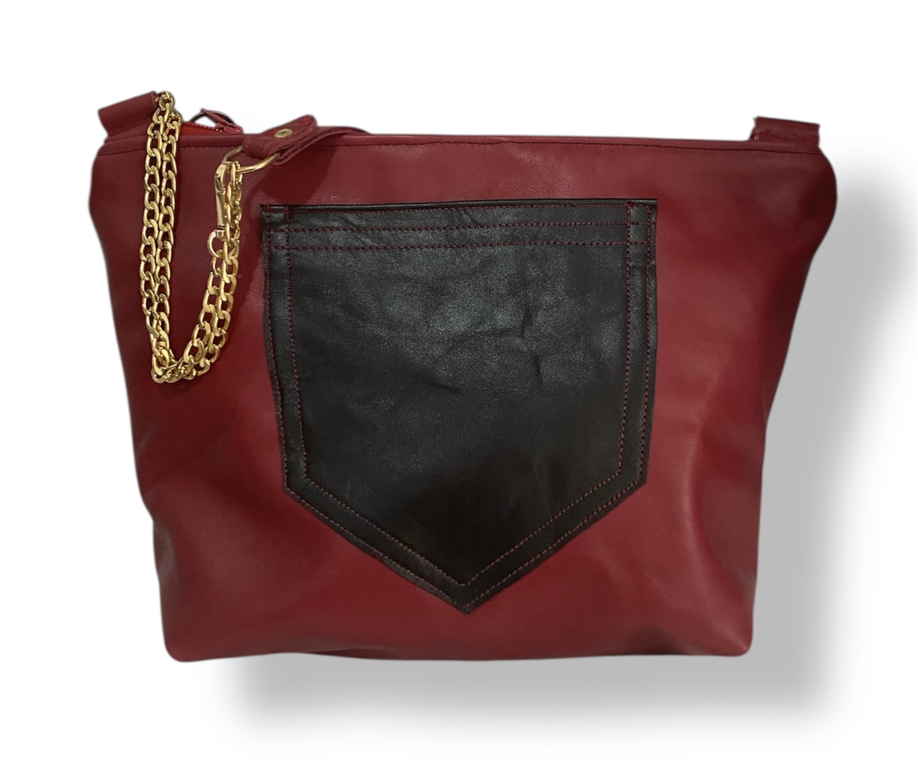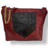 - Delantero: realizado con un retal de piel negra con un bolsillo granate .