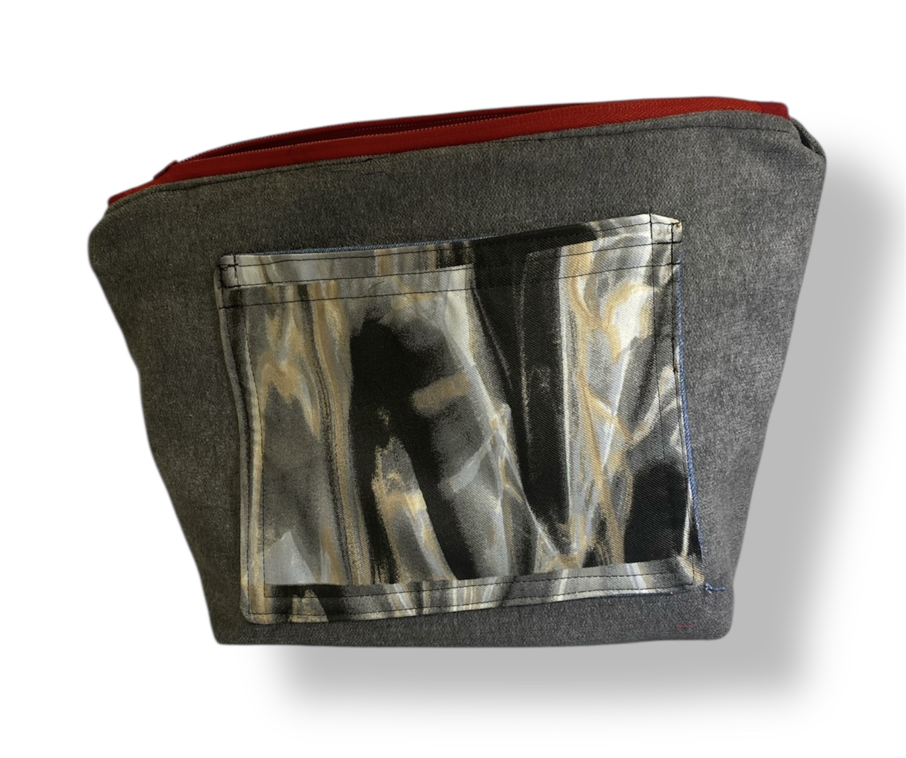- Trasero: realizado con el mismo retal granate y un bolsillo negro .