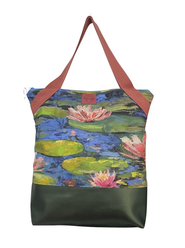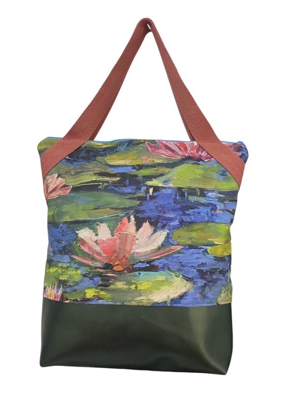 - Bolso realizado con loneta inspirada en el impresionismo el cuadro de los nenúfares de Monet y piel ecológica verde metalizada.