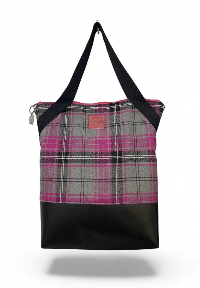 Tote Bag inspirado en Escocia en su tejido más conocido e Tartán aunque con un color más moderno , rosa gris y negro .