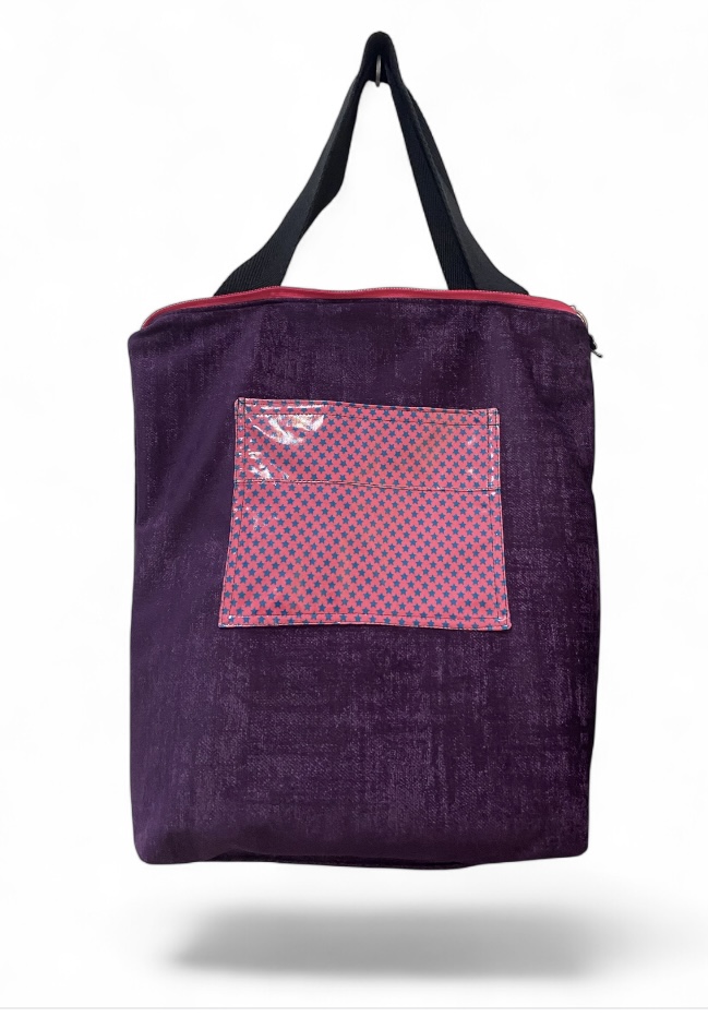 Bolso realizado con Tartán escocés de cuadros rosas grises y negros , el final del bolso está realizada con eco piel negra .